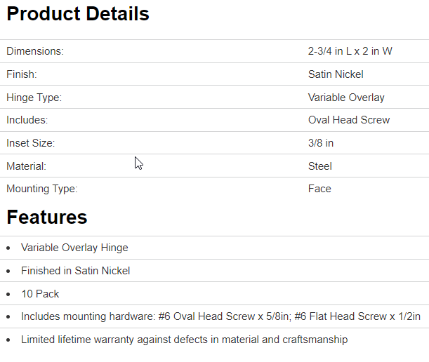 The Amerock 10PKR3429G10 Variable Overlay Hinge is finished in Satin Nickel.