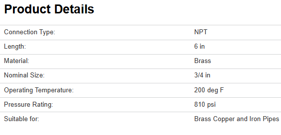 Anderson Metals Pipe Nipple, Nominal Size: 3/4 in, NPT Connection, 810 psi, Operating Temperature: 200 deg F, Brass, 6 in L, Suitable for: Brass, Copper and Iron Pipes