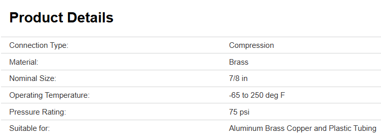 Anderson Metals Pipe Union, Nominal Size: 7/8 in, Compression Connection, 75 psi, Operating Temperature: -65 to 250 deg F, Brass, Suitable for: Aluminum, Brass, Copper and Plastic Tubing