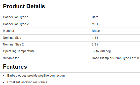 Barb x male pipe. One piece brass. Use with plastic tubing or rubber hose. Intended for use with hose clamp or crimp type ferrule. 32 to 200 deg F temperature range. Barbed edges provide positive connection. Excellent vibration resistance. Barb size is hose ID.