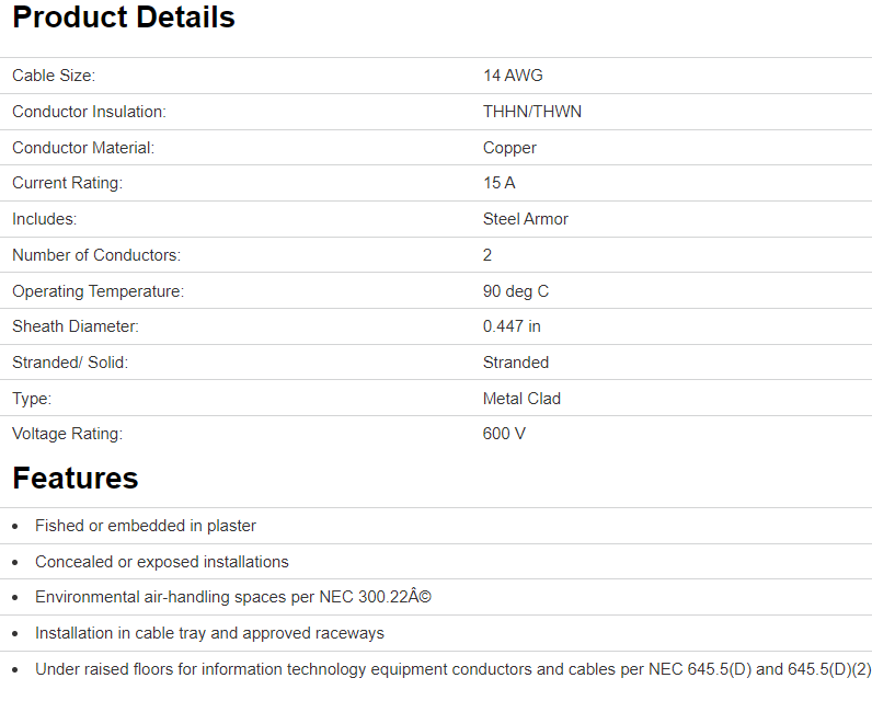 Constructed with soft-drawn copper, type THHN insulated conductors which are individually wrapped with a moisture-resistant, flame-retardant paper covering. Interlocking steel armor is applied over the assembly. A 16 AWG aluminum bond wire is placed inside the armor, runs longitudinally and is in intimate contact with the armor for its entire length. General applications include dry locations only, branch, feeder and service power distribution in commercial, industrial, institutional and multi-residential buildings, power, lighting, control and signal circuits, concealed or exposed installations, installed in cable tray and approved raceways, environmental air-handling spaces per NEC and under raised floors for information technology equipment conductors and cables per NEC 645.5(D) & 645.5(D)(2). 300.22(C), fished or embedded in plaster. Meets or exceeds the requirements of UL standard 4 for armored cable, UL standard 83, Federal Specification A-A59544 (formerly J-C-30B) and the National Electrical Code. Listed for use in UL 1, 2 and 3 hrs through-penetration firestop systems.
