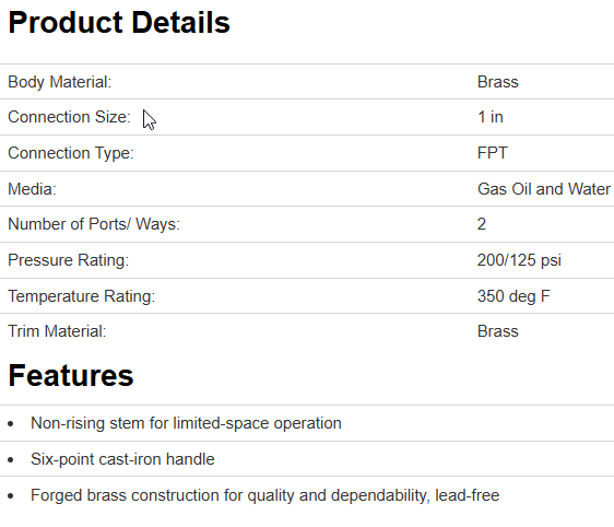 Standard port, non-rising stem, six-point cast-iron handle, brass wedge disk, threaded ends comply with ANSI B1.20.1, certified to NSF 61.