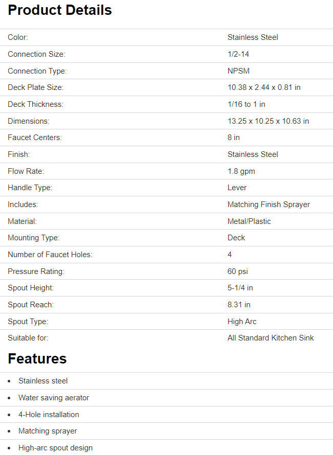 Boston Harbor Kitchen Faucet, 1/2-14 Connection, NPSM Connection, 1.8 gpm, 60 psi, Deck Plate Size: 10.38 x 2.44 x 0.81 in, Deck Thickness: 1/16 to 1 in, Spout Type: High Arc, Spout Reach: 8.31 in, Spout Height: 5-1/4 in, Lever Handle, Metal/Plastic, Stainless Steel, Stainless Steel, Deck Mounting, Number of Faucet Holes: 4, Faucet Centers: 8 in, Dimensions: 13.25 x 10.25 x 10.63 in, Suitable for: All Standard Kitchen Sink, Includes: Matching Finish Sprayer