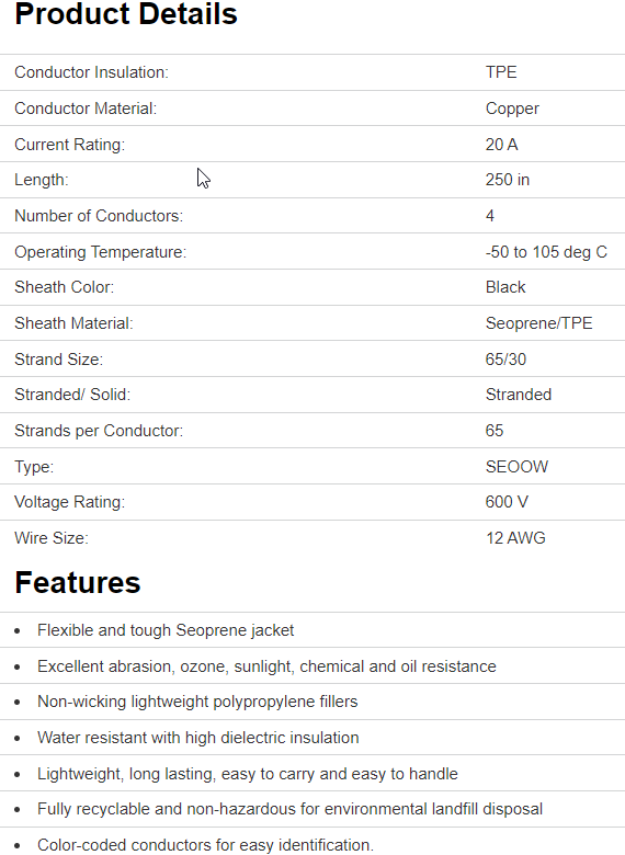 Extra hard usage per NEC. Used for garages, portable tools and lights, battery chargers. Weather-resistant for outdoor applications, dishwashers and refrigerators. Resists most acids 10 AWG through 14 AWG, 60 deg Celsius to 105 deg C. Soft annealed stranded copper per ASTM B3-90 conductor. TPE class 36, rubber insulation. TPE weather-resistant class 36, black rubber jacket. UL 62, UL1581, CSA approved. Black, 250 ft spool.