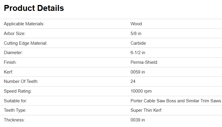 Micrograin titanium carbide, thin kerf, saw blade used for ripping and crosscutting applications. Alternate top bevel, .040" plate, .059" kerf, 15 degree hook angle, 10,000 max rpm.