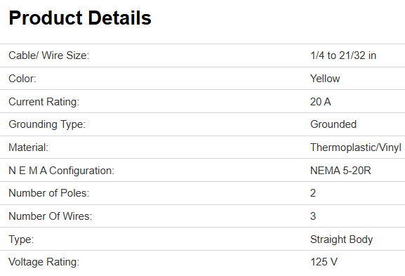 Terminals in individual chambers to positively insulate conductors. Terminal screw clamps are designed to contain wire and prevent binding. Terminal screws backed out, ready for wiring. Nylon Kwiklok features patented twist-actuated internal cord clamp, reduces installation time. Meets all UL 498 requirements. Yellow color.