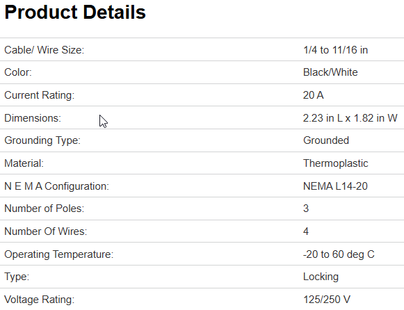 Abuse-resistant thermoplastic construction. Back wire terminal clamps for easy secure wiring. External cable clamp provides firm strain relief. Individual wiring compartments with tapered channel for easy insertion of wires. Clear cover over wiring compartments allow easy inspection of wiring terminations. Triple combination head screws standard - slot/Phillips/Robertson for use in the US and Canada. Clearly marked rating, standard compliances on face. 20 A - 125/250 V. NEMA L14-30.