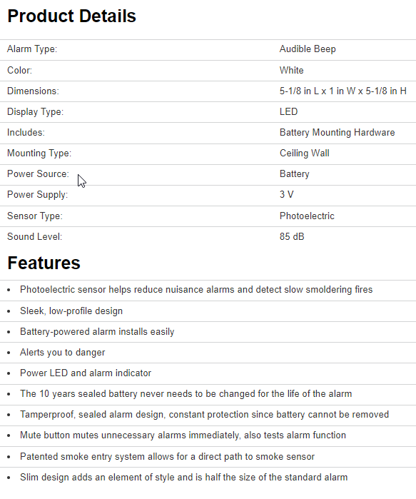The First Alert PR710 slim photoelectric smoke alarm with ten year battery helps protect your home by providing up to a decade of uninterrupted monitoring. This low-profile smoke alarm uses an ultra-reliable photoelectric sensor to detect smoke from slow-burning, smoldering fires. Half as thick as a standard alarm, this detector has a slim, contemporary design that mounts unobtrusively on a wall or ceiling. A built-in 10 years lithium-ion battery provides continuous power, with no need to ever worry about changing the battery over the lifetime of the smoke detector.