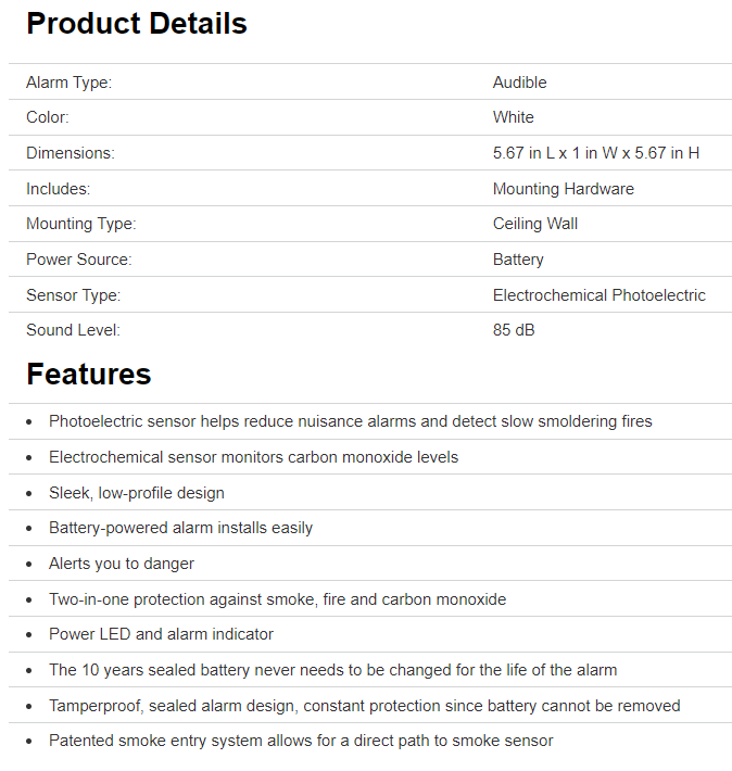 The First Alert PRC710 slim photoelectric smoke and carbon monoxide alarm with ten year battery helps protect your home from two potentially deadly threats by providing up to a decade of uninterrupted monitoring. Equipped with dual sensors, this low-profile alarm detects smoke from slow-burning, smoldering fires. Half as thick as a standard alarm, this detector has a slim, contemporary design that mounts unobtrusively on a wall or ceiling. A built-in 10 years lithium-ion battery provides continuous power, with no need to ever worry about changing the battery during the lifetime of the alarm.