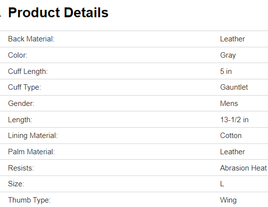 Split leather palm and back. Extended gauntlet safety cuff offers extra wrist and forearm protection. Cotton lining for moisture absorption. Self-hemmed welting's in seams to provide extra strength to seams adding durability and strength to the glove. Forney imprint on glove.