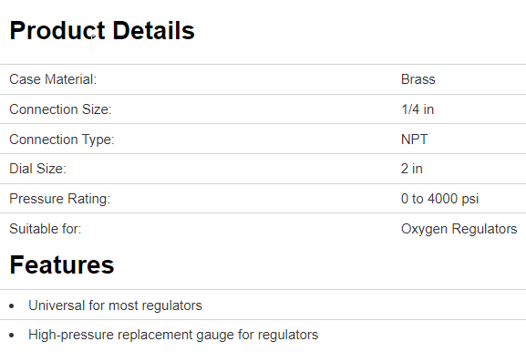 2 in (50.8 mm) face with 1/4 in (6.35 mm) national pipe thread (NPT). Features threads that are common to "Forney", "Victor", "Harris", "Smith" and "Marquette" compatible regulators. Solid brass threads and brass casings provide extra long life.