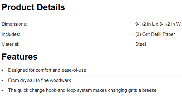 Sand large areas including drywall with ease. The "Quick-change" hook-and-loop holding system allows faster sheet changes. Sanding sheet refills: SKU # 755.4231, # 528.7214, #833.8048.