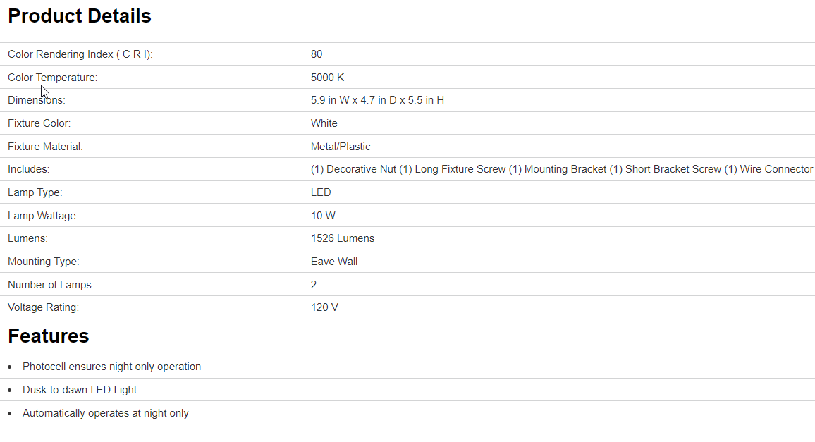 Non-motion security light. Metal, plastic, glass construction. Integrated LED, 1526 Lumens, 5000K, 80 CRI, hardwired. Photocell ensures night only operation. 5.9 in W x 4.7 in D x 5.5 in H, 2.03 lb. ETL/cETL listed.