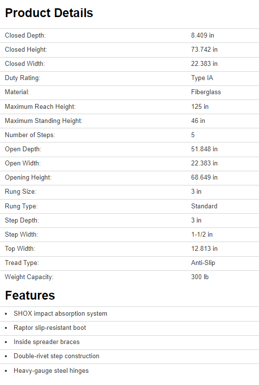 This Louisville 6 ft non-conductive fiberglass industrial twin front step ladder has a load capacity of 300 lb, rated ANSI Type IA. This ladder is equipped with raptor boot with non-marring bonded tread mechanically fastened to the upper boot to create a secure slip-resistant footing, SHOX impact absorption system, heavy-gauge steel hinges, inside spreader braces and double-rivet step construction. Twin front step ladders allow two users to work on the same ladder simultaneously to easily accomplish tasks that would be more difficult for a single person. The Louisville FM1506 twin front step ladder meets or exceeds the safety standards set by ANSI, CSA and OSHA.