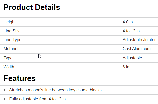 Made from cast aluminum. Used to stretch mason's line tight between key course blocks.