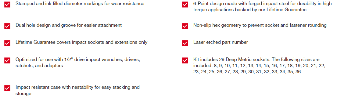 Our SHOCKWAVE Impact Duty™ 1/2" Drive 6 Point Socket Sets feature the boldest, longest-lasting markings and extreme impact durability in high torque applications. The stamped and ink-filled size marking enables you to select the right socket every time throughout the life of the socket. These sockets are engineered with high strength forged steel for optimized performance in heavy-duty applications. The non-slip hex geometry prevents fastener rounding, and a dual-hole design and ring groove allow for easy socket attachment and removal. The storage cases are impact resistant and nest together for easy stacking and storage. All MILWAUKEE® SHOCKWAVE Impact Duty™ Sockets backed by a Lifetime Guarantee and meet ASME indu