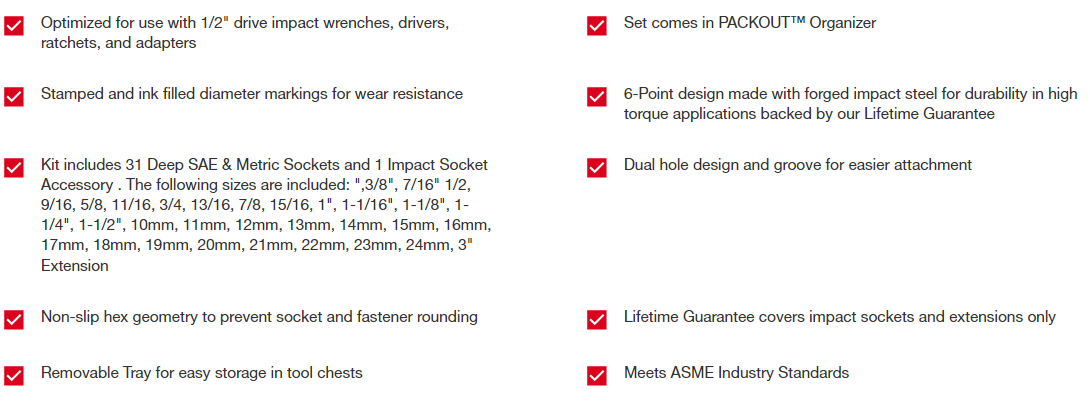 Our SHOCKWAVE Impact Duty™ Socket Set features the boldest, longest-lasting markings and extreme impact durability in high torque applications. The stamped and ink-filled size marking enables you to select the right socket every time throughout the life of the socket. Engineered with high-strength forged steel for optimized performance in heavy-duty applications. The non-slip hex geometry prevents fastener rounding. Our dual-hole design and ring groove allow for easy socket attachment and removal. Sets can be kept organized in the included PACKOUT™ Organizer with a clear top for easy identification of parts at a glance. The PACKOUT Organizer is part of our PACKOUT Modular Storage System, allowing for customization of storage systems to easily transport and organize tools and accessories. All SHOCKWAVE Impact Duty ™ Sockets and Extensions are backed by our Lifetime Guarantee and meet ASME industry standards.