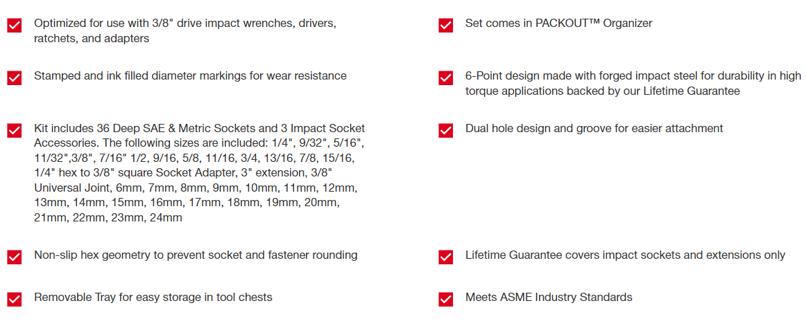 Our SHOCKWAVE Impact Duty™ Socket Set features the boldest, longest-lasting markings and extreme impact durability in high torque applications. The stamped and ink-filled size marking enables you to select the right socket every time throughout the life of the socket. Engineered with high-strength forged steel for optimized performance in heavy-duty applications. The non-slip hex geometry prevents fastener rounding. Our dual-hole design and ring groove allow for easy socket attachment and removal. Sets can be kept organized in the included PACKOUT™ Low-Profile Organizer with a clear top for easy identification of parts at a glance. The Low-Profile Organizer is part of our PACKOUT Modular Storage System, allowing for customization of storage systems to easily transport and organize tools and accessories. All SHOCKWAVE Impact Duty ™ Sockets and Extensions are backed by our Lifetime Guarantee and meet ASME industry standards.