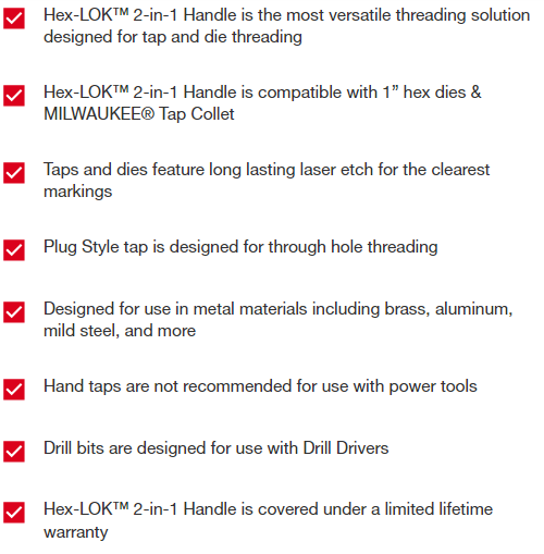 Our MILWAUKEE® 38-Piece Metric Tap & Die PACKOUT™ Set includes precision machined threading accessories and the most versatile Hex-LOK™ 2-in-1 Handle for the most common applications. The set features 17 straight-flute taps and 17 1” hex dies with long-lasting laser-etched sizing for the clearest markings and includes a protective Black Oxide coating for corrosion resistance. The Hex-LOK™ 2-in-1 Handle combines the benefit of both internal and external threading within one handle by its compatibility with both 1” hex dies and the MILWAUKEE® tap collet. The handle’s ergonomic grip is designed to deliver ultimate user comfort while cutting threads. The all-metal construction allows for tool-free die and tap collet changes and is optimized for maximum balance and control when threading. The Plug Taps square shank is compatible with all standard tap handles or tap wrenches and is designed for through-hole threading. The Hex Dies 1” hex shape is compatible with the Hex-LOK™ 2-in-1 Handle, as well as all standard 1” Hex Die stocks. Our Taps and Dies are designed for cutting threads in the most common metal applications including brass, aluminum, mild steel, and more. For best results, use with cutting fluid. The set is organized in a PACKOUT™ Low-Profile Compact Organizer and includes a removable storage tray for versatile storage.