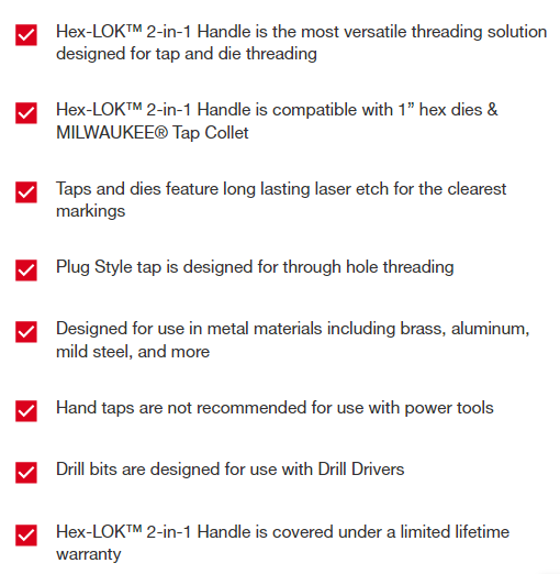 Our MILWAUKEE® 38-Piece SAE Tap & Die PACKOUT™ Set includes precision machined threading accessories and the most versatile Hex-LOK™ 2-in-1 Handle for the most common applications. The set features 17 straight-flute taps and 17 1” hex dies with long-lasting laser-etched sizing for the clearest markings and includes a protective Black Oxide coating for corrosion resistance. The Hex-LOK™ 2-in-1 Handle combines the benefit of both internal and external threading within one handle by its compatibility with both 1” hex dies and the MILWAUKEE® tap collet. The handle’s ergonomic grip is designed to deliver ultimate user comfort while cutting threads. The all-metal construction allows for tool-free die and tap collet changes and is optimized for maximum balance and control when threading. The Plug Taps square shank is compatible with all standard tap handles or tap wrenches and is designed for through-hole threading. The Hex Dies 1” hex shape is compatible with the Hex-LOK™ 2-in-1 Handle, as well as all standard 1” Hex Die stocks. Our Taps and Dies are designed for cutting threads in the most common metal applications including brass, aluminum, mild steel, and more. For best results, use with cutting fluid. The set is organized in a PACKOUT™ Low-Profile Compact Organizer and includes a removable storage tray for versatile storage.