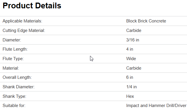 • Durable carbide tip for longer life in concrete and hard aggregate