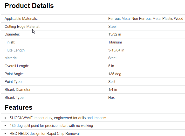 Milwaukee® SHOCKWAVE Impact Duty™ titanium drill bits with RED HELIX™ are engineered for impacts and drills. Designed with a variable Helix™ with an aggressive 35 deg helix angle which ends at 15 deg, the Impact Duty™ titanium drill bits with RED HELIX™ provide Rapid Chip Removal™ to limit heat build-up to stay Sharper Longer™. The 135 deg split point tip delivers a precision start and prevents walking for fast, accurate holes. Titanium coating can be used in all drilling applications to give you up to 3X life versus black oxide Drill Bits™.