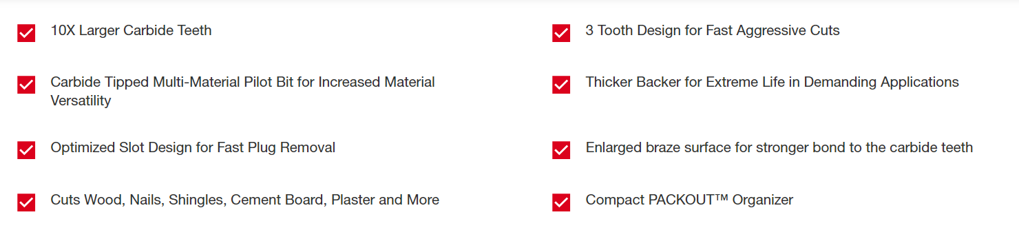 MILWAUKEE® BIG HAWG™ with Carbide Teeth is first-to-market in providing extreme life and durability in both nail-embedded wood and abrasive material applications. Utilizing advanced carbide technology, the new BIG HAWG™ with Carbide Teeth gives users 50x life in demanding applications with the ability to cut 1000+ more nails. 10X larger carbide teeth rip through materials 5X faster while deeper slots make for fast and easy plug removal. BIG HAWG™ with Carbide Teeth allows users to cut through the toughest materials including nails, cement board, shingles, plaster and stucco.