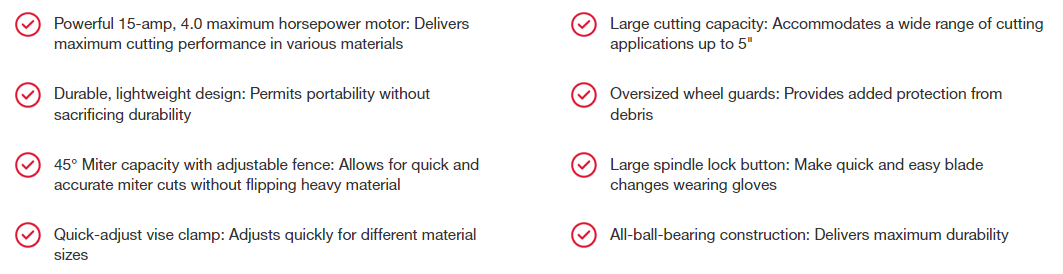 Get industry-leading performance, durability and ease of use in a versatile cut-off machine that handles a wide variety of materials. With a powerful 15-amp, 4.0 maximum horsepower motor and speeds up to 3900 RPM, this abrasive cut-off machine allows for fast cutting of drywall track in bundles, angle iron, conduit, pipe, channels, tubing and rebar up to a 5” maximum capacity. With an adjustable fence, it can make 45° miter cuts quickly and accurately without flipping heavy material. Lightweight yet highly durable, this 14” cut-off machine travels easily to any jobsite. A large spindle lock button lets you make quick and easy blade changes, even when wearing gloves. A quick-adjust vise clamp lets you make fast adjustments when cutting materials of different sizes.