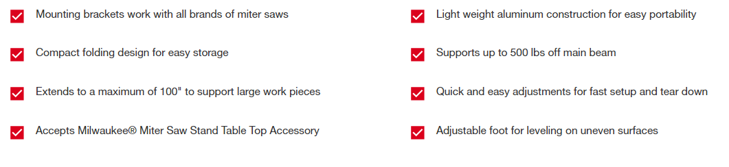 The Milwaukee® 48-08-0551 is designed for increased portability and jobsite durability. With aluminum main beam construction, the Milwaukee Folding Miter Saw Stand weighs in at only 31 lbs. Steel legs and support extensions are designed from maximum strength and rigidness to support even the heaviest work pieces. An adjustable foot ensure a sturdy, level work area even in uneven locations. The 48-08-0551 is also compatible with the Milwaukee Miter Saw Stand Table Top (48-08-0552) allowing users to keep items like pencils, tapes, blue prints and other items close at hand as well as perform secondary applications like sanding, coping or routing near their saw. An optional carrying strap (48-08-0553) makes moving the stand on and off the site easy and allows you to transport other items at the same time, increasing productivity.