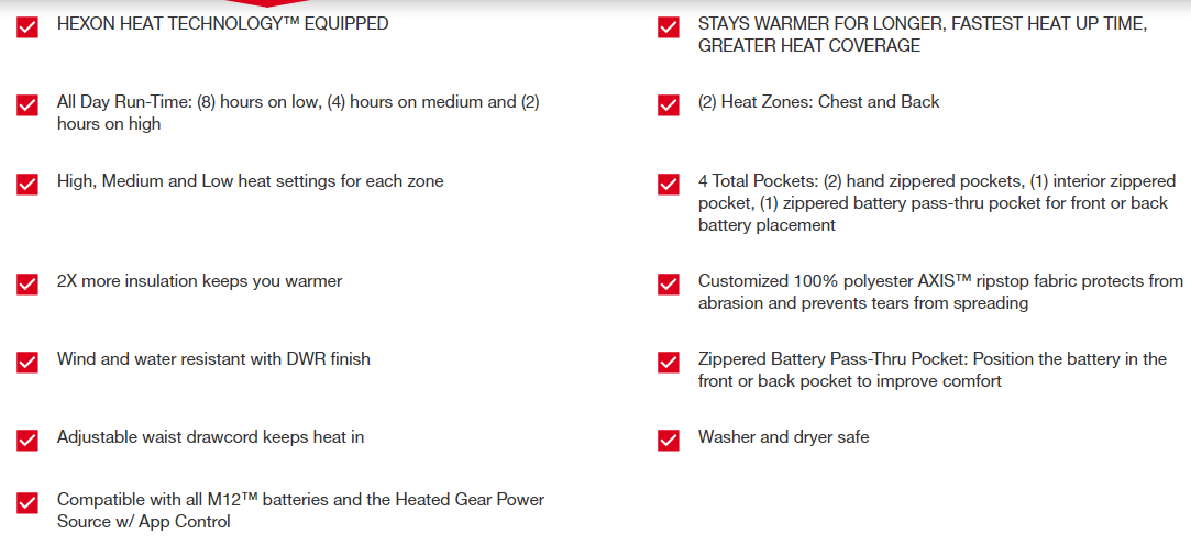 Our M12™ Heated AXIS™ Vest delivers HEAT BUILT FOR LIGHTWEIGHT DURABILITY. Powered by Milwaukee’s NEW HEXON HEAT TECHNOLOGY™, this vest STAYS WARMER FOR LONGER in all temperatures, delivers the FASTEST HEAT UP TIME and offers GREATER HEAT COVERAGE throughout the garment. Whether facing freezing outdoor temperatures or navigating spaces with minimal heat indoors, this vest adapts to its environment to deliver effective heat in any condition. By integrating HEXON HEAT TECHNOLOGY™ and 2X more insulation, optimal comfort and mobility are achieved. With ground-up developed AXIS™ ripstop fabric, this MILWAUKEE® vest provides robust protection against the elements without sacrificing movement. The compressible, lightweight construction provides warmth whether worn as a mid-layer or durable exterior layer. The hidden battery pass-thru pocket allows for front or back battery placement, increasing versatility depending on the situation. Our Milwaukee® Heated Gear is developed in collaboration with feedback from users across the trades through continuous jobsite research.