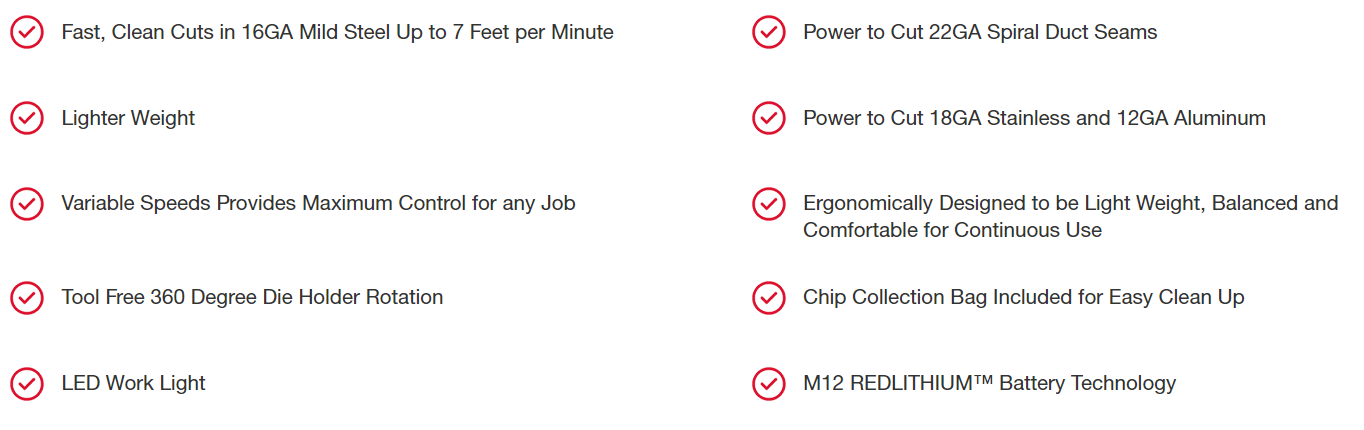 Our M12 FUEL™ 16-Gauge Variable Speed Nibbler is a compact light weight tool that provides the same cutting capacity as its 18V competitors on a 12V system. Delivering fast clean cuts in 16-gauge mild steel, the nibbler is rated for 18-gauge stainless steel and 12-gauge aluminum. Our M12 FUEL™ 16-Gauge Variable Speed Nibbler has the power to perform in heavy applications such as cutting up to 22-gauge spiral duct seams. The nibbler tool provides a variable speed dial, tool-free die holder orientation change, and LED work light offers maximum control and productivity. The unique chip collection bag, kitted with the tool, reduces jobsite cleanup. Our compact and light weight form factor enables greater access and mobility on the jobsite.