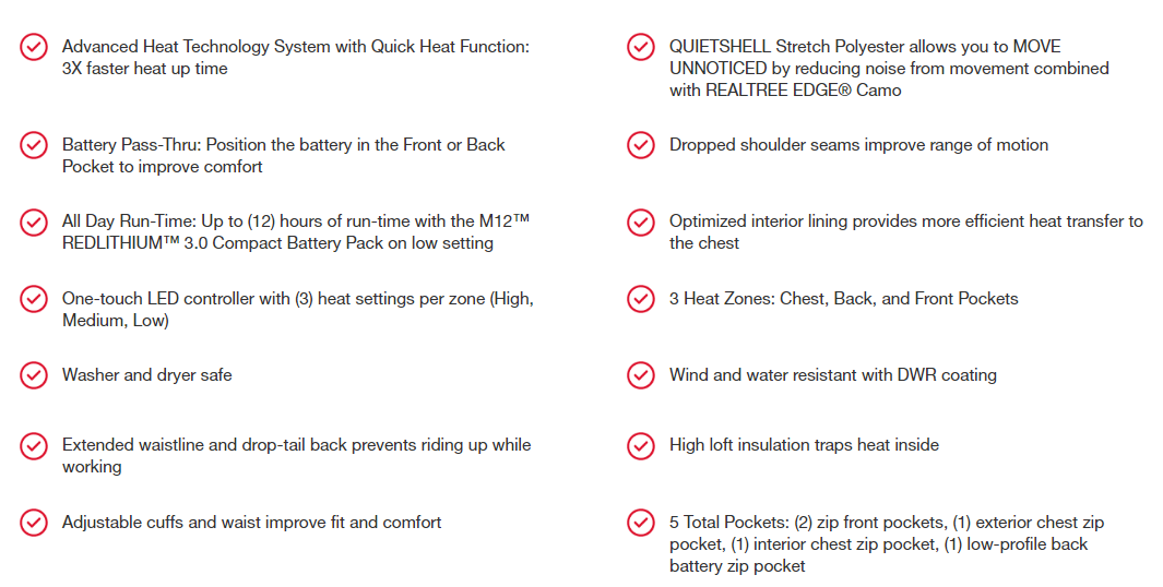 Our M12™ QUIETSHELL Heated Jacket is powered by M12™ REDLITHIUM™ Battery Technology and built with an advanced heat technology system. Combining lightweight and durable carbon fiber heating elements, Quick-Heat functionality, enhanced fabric construction, and optimized interior liners, the MILWAUKEE® M12™ QUIETSHELL Heated Jacket delivers HEAT BUILT TO MOVE SILENT. Featuring the Realtree Edge® camouflage pattern for use in wooded environments, QUIETSHELL Stretch Polyester reduces noise from movement and provides wind and water resistance. Our heated hunting jacket has a unique battery pocket Pass-Thru design that is easy to use with front or back pocket battery placement, providing you the versatility and comfort needed depending on the situation. This Milwaukee heated coat is a go-to for protection from the elements on the jobsite or when enjoying the outdoors.