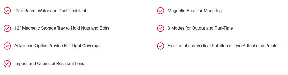 Our M12™ Underbody Light is the first of its kind, revolutionizing the way Automotive Mechanics execute underbody work. This innovative light delivers UNMATCHED MANEUVERABILITY & HANDS-FREE LIGHTING. Two swivel points with 300 degrees of horizontal rotation and up to 180 degrees of vertical rotation paired with a strong magnetic base allow for easy mounting and better positioning. This MILWAUKEE® M12™ light features a 12" magnetic storage tray to hold nuts and bolts. 1200 lumens of TRUEVIEW™ High-Definition Output gives you full coverage for all tasks under the vehicle. The M12™ Underbody Light can run up to 15 hours on low or 5 hours on high, providing all-day run-time on one XC4.0 Battery Pack. This LED underbody light is IP54 rated, impact, and corrosion-resistant to most chemicals found in the auto shop, guaranteed by a 5-year tool warranty. The high-quality LEDs never need to be replaced and are backed by a limited lifetime warranty.