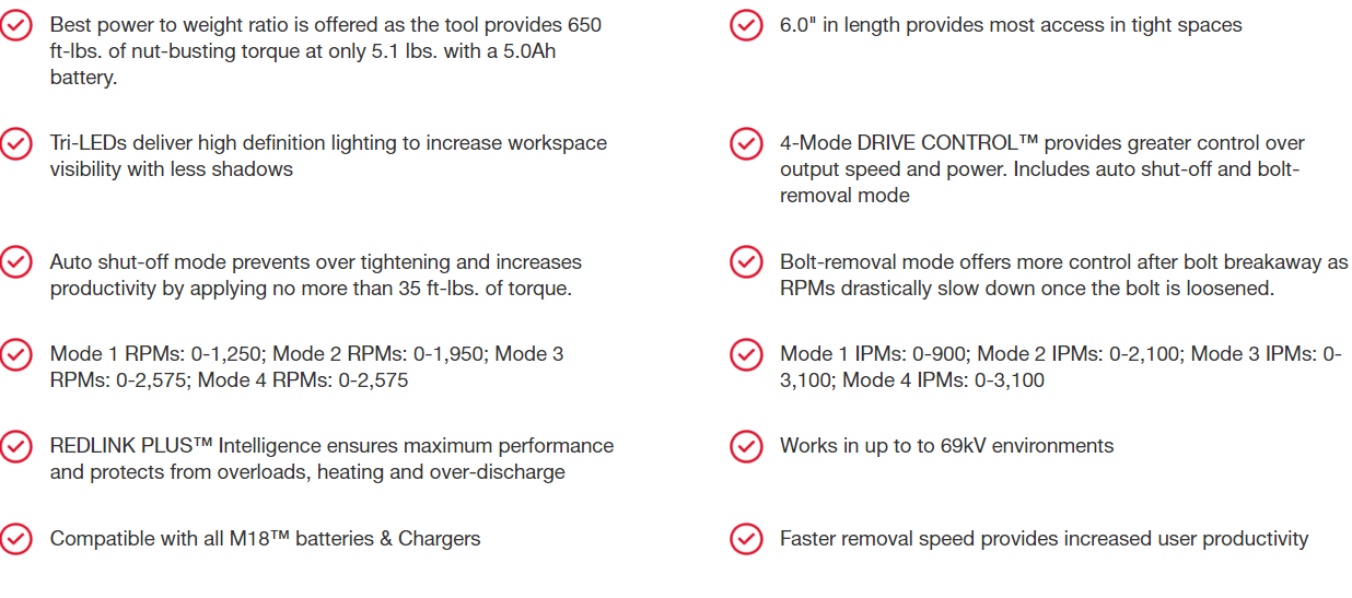 Our M18 FUEL™ 1/2" Mid-Torque Impact Wrench w/ Friction Ring delivers the best power to weight ratio, most access in tight spaces, and faster removal speed. It provides 650 ft-lbs of nut-busting torque and only weighs 5.1 lbs, making it extremely versatile, capable of performing a wide variety of applications. Its POWERSTATE™ Brushless Motor generates the power needed to quickly perform many tasks, such as removing large bolts or lug nuts. This MILWAUKEE® 1/2" Impact Wrench is the most compact in its class, giving you access to stubborn fasteners in spaces where larger impact wrenches can’t fit without needing to disassemble components to reach bolts. Tri-LEDs surround the anvil to deliver brighter light with fewer shadows. 4-Mode DRIVE CONTROL™ offers greater precision with a range of pre-set RPM and IPM levels, selectable from a single button on the tool. By selecting Mode 4, AUTO SHUT-OFF™ control applies no more than 35 ft-lbs of torque for hand-tight fastening applications to prevent overtightening. Mode 4 also features Bolt Removal Control that delivers you full torque output, then decreases RPMs once the bolt is loosened to prevent fastener drops. REDLINK PLUS™ Intelligence ensures maximum performance, protecting the tool against overloads, over-heating, and over-discharge. The M18™ REDLITHIUM™ battery pack (not included) fits M18™ tools, delivering more work per charge and more work over the life of the pack.