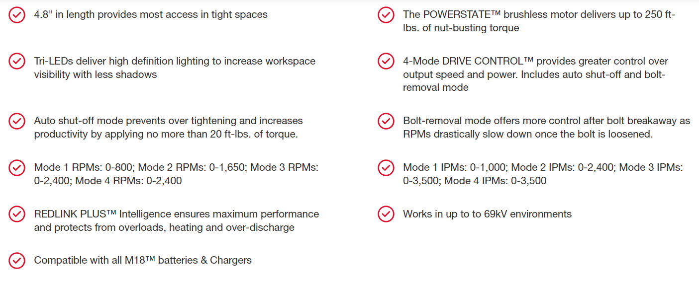 Our M18 FUEL™ 3/8" Compact Impact Wrench w/ Friction Ring is the most compact in its class, delivering you the most access in tight spaces, up to 250 ft-lbs of nut-busting torque, and maximum workspace visibility. This battery-powered impact wrench measures only 4.8" in length with a POWERSTATE™ Brushless motor to provide the power to remove stubborn fasteners, even in confined spaces. The MILWAUKEE® 3/8" Compact Impact Wrench has tri-LEDs that surround the anvil to deliver you brighter light with fewer shadows. 4-Mode DRIVE CONTROL™ offers greater precision with a range of pre-set RPM and IPM levels, selectable from a single button on the tool. By selecting Mode 4, AUTO SHUT-OFF™ control applies no more than 20 ft-lbs of torque for hand-tight fastening applications to prevent overtightening. Mode 4 also features Bolt Removal Control delivers full torque output, then decreases RPMs once the bolt is loosened to prevent fastener drops. REDLINK PLUS™ Intelligence electronics make these controls possible while ensuring maximum performance, protecting the tool against overloads, over-heating, and over-discharge. The M18™ REDLITHIUM™ battery pack (not included) fits M18™ tools, delivering more work per charge and more work over the life of the pack.