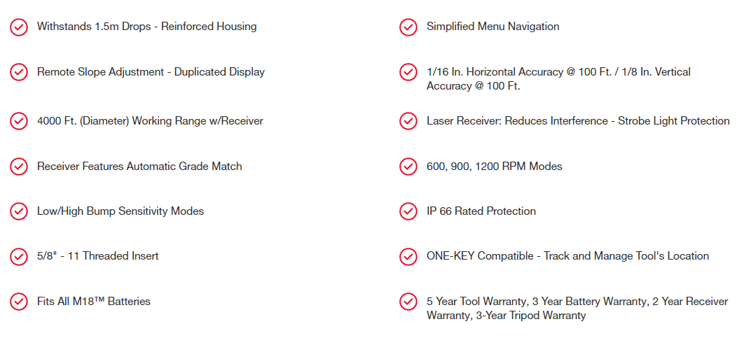 Our M18™ Red Exterior Dual Slope Rotary Laser Level Kit w/ Receiver & Remote features impact protection and a simplified setup. Designed for harsh jobsite conditions, we ensure your laser is protected, withstanding up to a 1.5M Drop and a 2M Tripod tip. Our receiver has simplified menu navigation and a user-friendly design. The laser's remote control provides a duplicated display of the interface on the laser itself, which provides the ability to adjust the slope remotely. The receiver will detect the laser up to 4000 ft (Diameter) and has built-in strobe light protection, reducing interference and downtime on the jobsite. This laser is the ultimate tool for accurate results for all leveling, aligning, and squaring jobs. The M18™ Red Exterior Dual Slope Rotary Laser is a part of the M18™ System, fully compatible with over 200+ solutions.