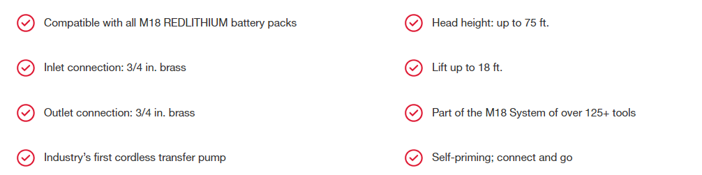 Our M18™ Transfer Pump offers you faster water transfers and service calls. This portable water transfer pump is the industry’s first cordless transfer pump, offering you the fastest setup. With an innovative self-priming pump, you can connect and go quicker than ever. The Milwaukee transfer pump's flexible impeller and powerful pump move water at up to 480 Gal. per hour, generates up to 18 ft. of lift and produces up to 75 ft. of head height. As a part of the MILWAUKEE® M18™ System, REDLITHIUM™ battery packs power the water transfer pump, which delivers up to 240 Gal. moved per charge on an XC5.0 battery pack. Onboard REDLINK™ Intelligence can recognize when the tool stops moving water and automatically shuts itself off to avoid dry pumping. REDLINK™ also provides optimized performance and overload protection in abusive situations.