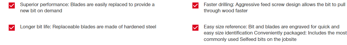 The 5-Piece SwitchBlade™ Bit Plumber's Kit offers a convenient assortment of the Milwaukee® SwitchBlade™ Selfeed Bits commonly used on the jobsite. Milwaukee SwitchBlade Selfeed Bits drill up to 12% faster and deliver up to 2X longer life. Designed for any trade that demands repetitive cutting of large holes in wood, SwitchBlade bits allow you to remove and replace blades rather than resharpen. You get a new bit with every quick, convenient change of the hardened steelblade, and less downtime on the job. An aggressive feed screw design enables the bit to pull through quickly for faster drilling. Built to last and designed to perform, Milwaukee SwitchBlade Selfeed bits deliver more holes for the money. The kit includes bits in diameters 1-3/8", 1-1/2", 2-1/8", and 2-9/16". Also included are 4 replacement blades, 4 feed screws, 4 set screws, a 5-1/2" Quik-Lok® extension and a hex key, all in an impact resistant carrying case.