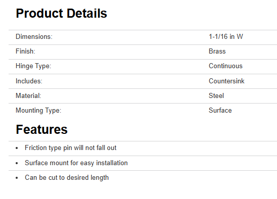 National Hardware V570 Hinge, Hinge Type: Continuous, Surface Mounting, Steel, Brass, Dimensions: 1-1/16 in W, Includes: Countersink