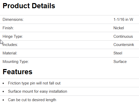 National Hardware V570 Hinge, Hinge Type: Continuous, Surface Mounting, Steel, Nickel, Dimensions: 1-1/16 in W, Includes: Countersink