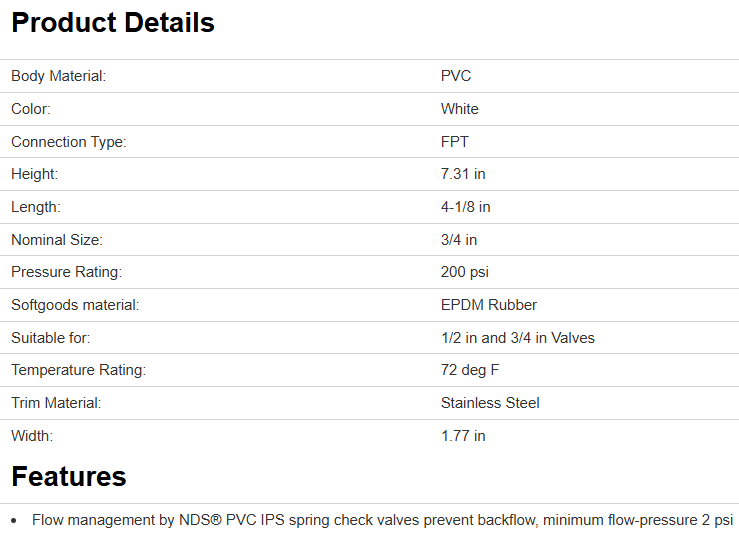 Made of high-impact PVC Type II material. 1/2 lb spring gives positive seal with no back pressure. Reinforced poppet. Designed for any system where back flow is not desired. Spas, swimming pools, industrial and irrigation. Complies with all applicable ASTM and ANSI standards.