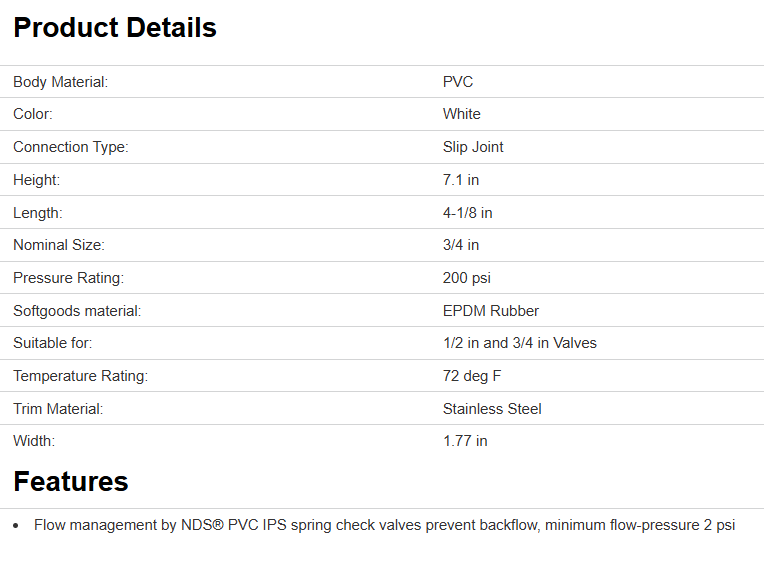 Made of high-impact PVC Type II material. 1/2 lb spring gives positive seal with no back pressure. Reinforced poppet. Designed for any system where back flow is not desired. Spas, swimming pools, industrial and irrigation. Complies with all applicable ASTM and ANSI standards. KC-1500-S and KC-2000-S are UL recognized spa component.