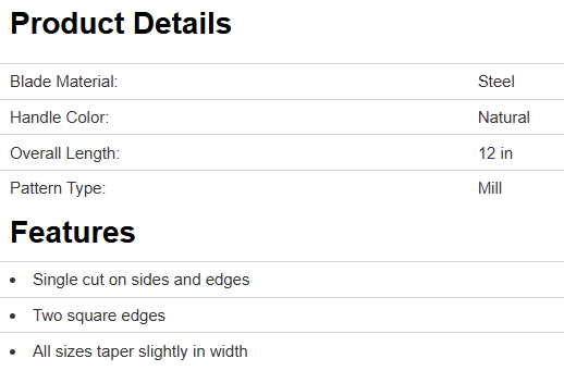 Rectangular shape, single cut on sides and edges, two square edges, all sizes taper slightly in width. Used for sharpening mill or circular saws or draw-filing and finishing metals.