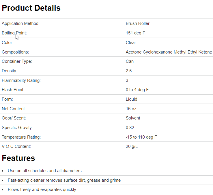Oatey Clear Cleaner is a simple and effective cleaner formulated for ABS, PVC and CPVC pipe and fittings that flows freely and evaporates quickly.