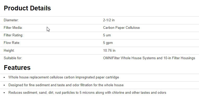 OMNIFilter's TO1 whole house cellulose impregnated carbon paper cartridges are used for the reduction of sand, dirt, sediment and rust particles. They help to protect your plumbing and appliances from getting plugged with sediment, causing costly repairs. They also reduce tastes and odors, making the water more pleasant. They are a cost effective solution for homes with sediment problems when used on chlorinated water supplies.
