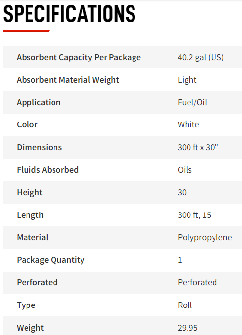 Sorbent Roll - Perforated, Polypropylene Material, White Color, 30 in Wide, 300 ft Long, 40.2 gal Absorbent Capacity per Package, 1 Per Package