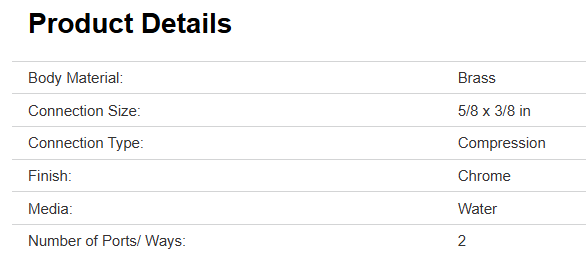5/8 in OD Compression x 3/8 in OD. Valve pushes on to PEX, CPVC or copper, double O-ring seal, safety clip, Use for tight spots, a shorter stub out or finished wall/floor.