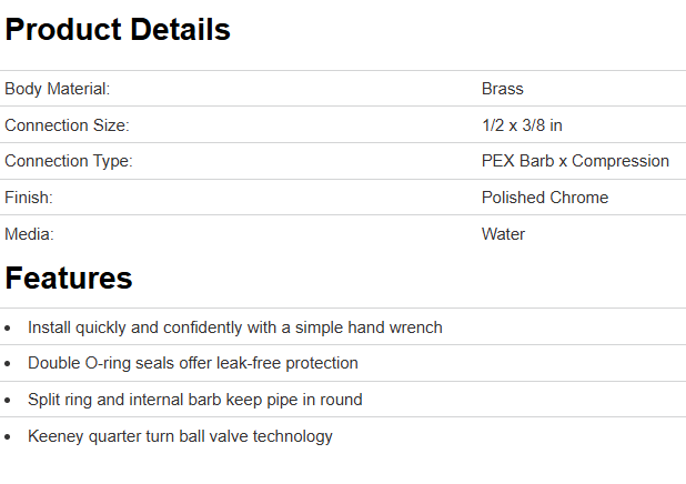 Keeney is excited to announce our no crimp PEX valves. No crimp PEX valve connections can be completed with the use of simple hand tools making installation identical to common compression connections for other pipe materials. These valves are quick and easy to install by simply tightening the nut on to the valve, causing the sleeve to compress around the pipe while the internal barb and double O-ring seal produces a leak free connection. They also feature Keeney's quarter turn ball valve technology that is known and trusted for it's quality and durability.