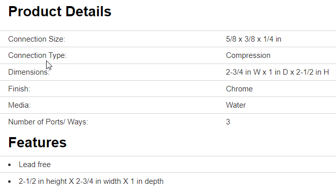 Plumb Pak Stop Valve, 5/8 x 3/8 x 1/4 in Connection, Compression Connection, Number of Ports/Ways: 3, Media: Water, Chrome, Dimensions: 2-3/4 in W x 1 in D x 2-1/2 in H