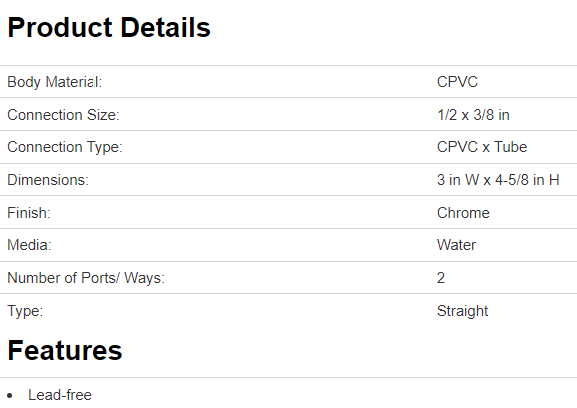 PlumbPak PP32-2PCLF Straight Transition Valve, 1/2"CPVC X 3/8"C